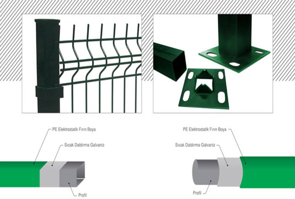 Panel çitler, sıcak daldırma galvaniz üzeri 100-120 mikron elektrostatik fırın boya kaplıdır. Ayrıca, istenilmesi halinde Plascoat elektrostatik fırın boya ile üretim yapılabilmektedir.