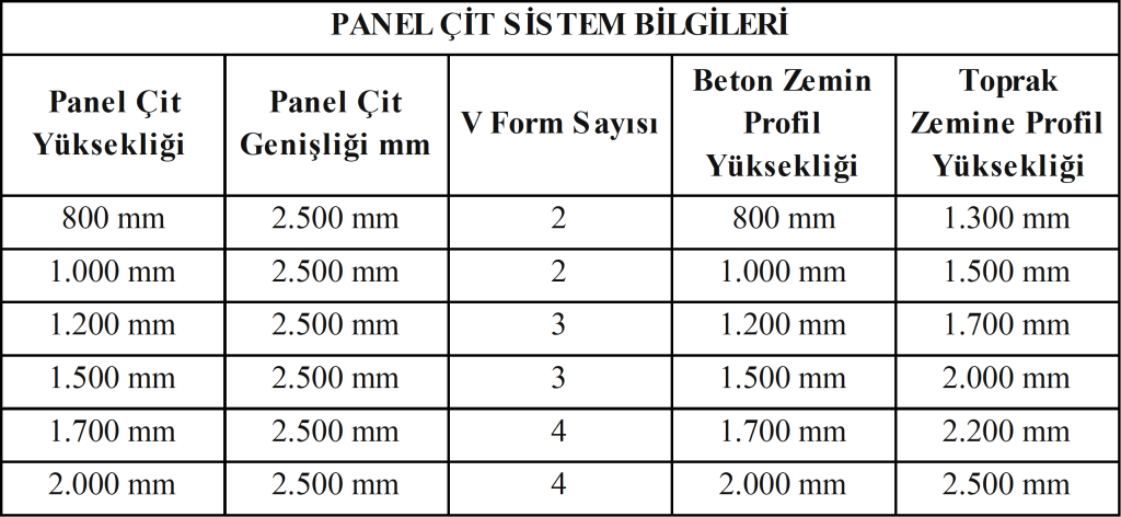 Sistem aksesuarları özel geliştirilmiş olup, her türlü zemine kolaylıkla ve yüksek hızla montaj imkanı sağlar. Panel Çit Sistemi eni 2500mm olan paneller, 800mm ile 2000mm arasında değişen ve tüm ihtiyaçlara çözüm sunabilecek yüksekliklerde üretilmektedir.